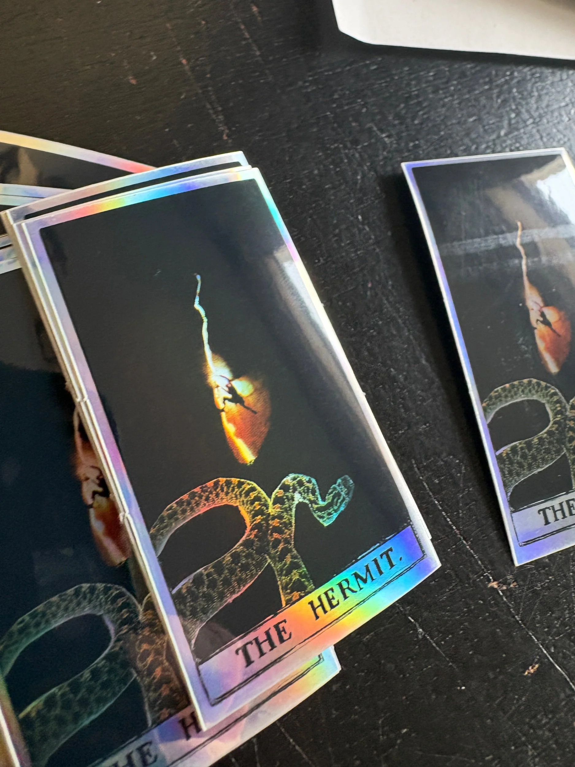For my granola gorls, this collage shows a climber scaling a slot canyon with a rattlesnake in the foreground. I chose a climber to reflect the facets of the hermits journey: climbing is a solitary act that outwardly takes great effort. But unseen is the inward mental game that requires intuition and feeling around. In this setting, the climber’s goal is to head toward the light -- just like the Waite-Smith depiction. I ham-fisted the snake to represent the never ending quest for knowledge.
